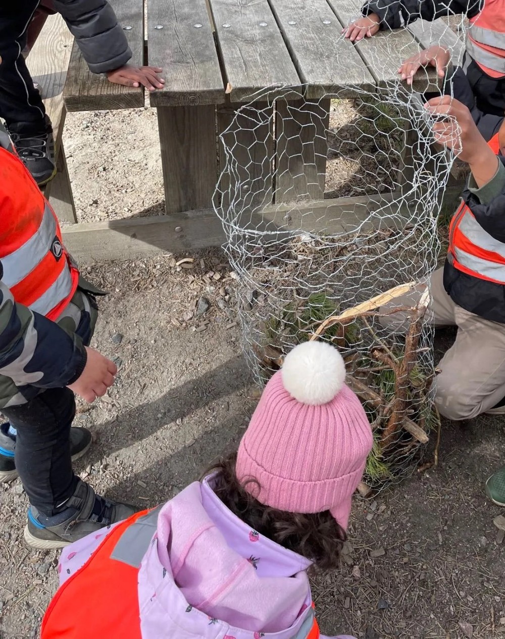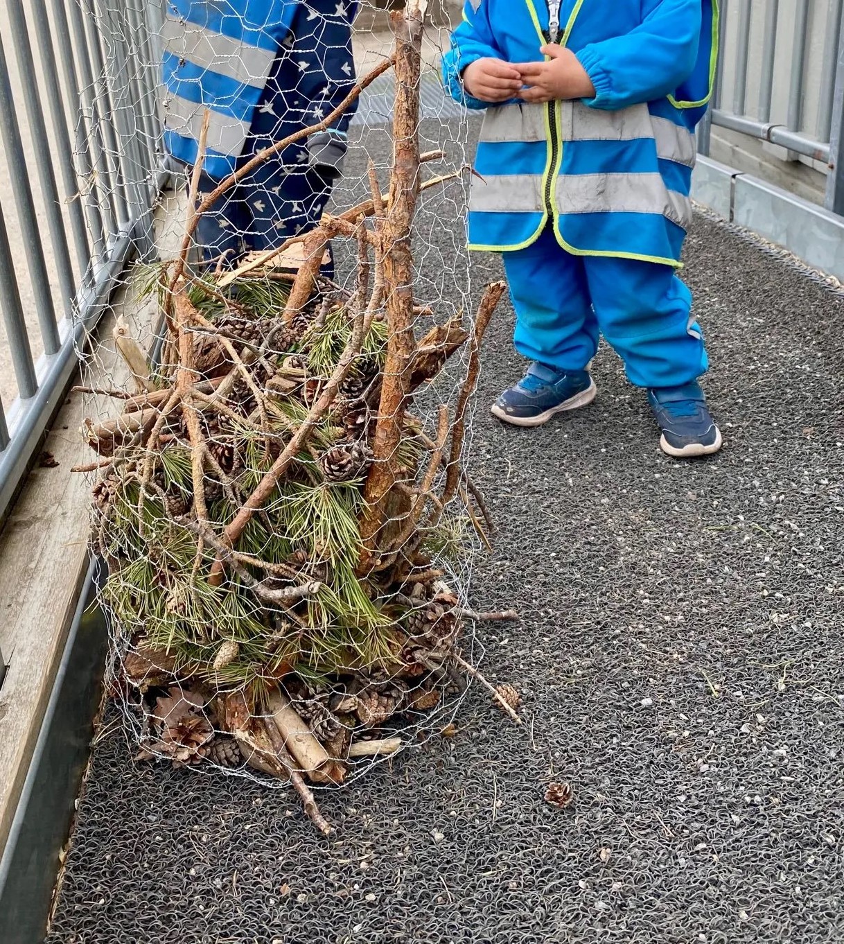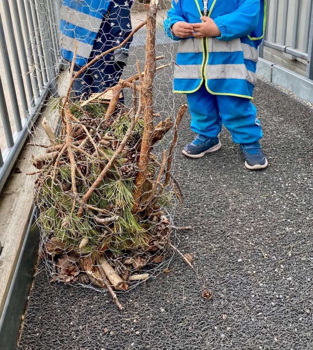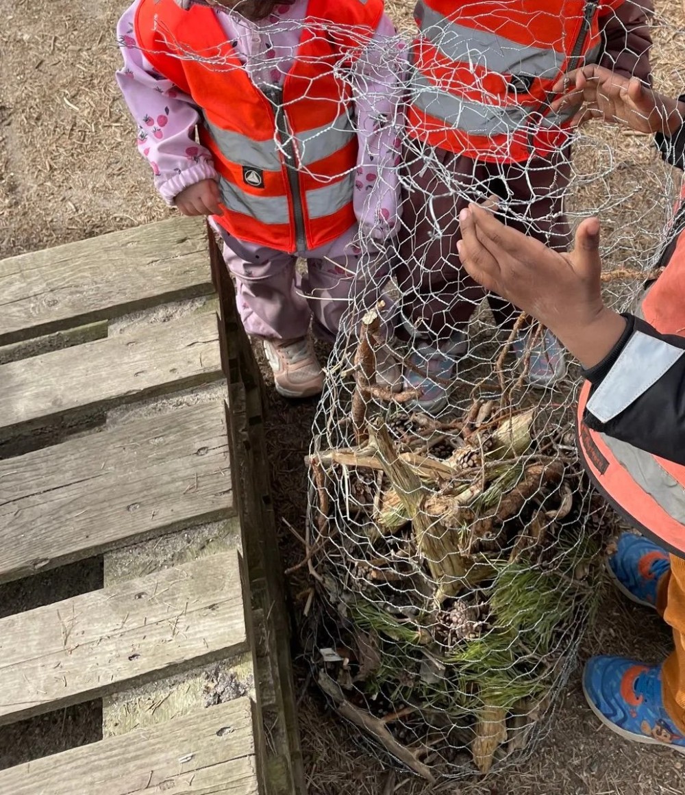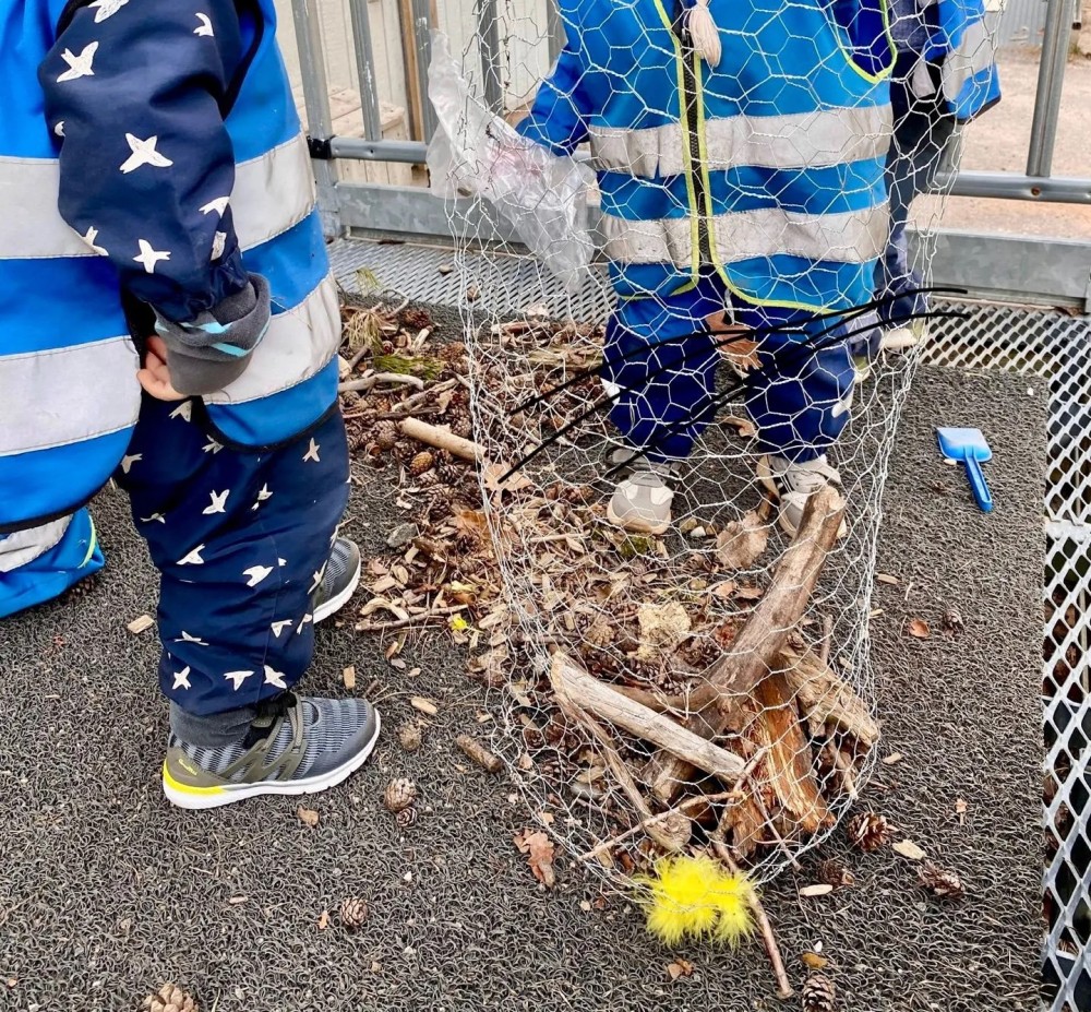 Barnehagen fikk i oppgave å fylle en beholder laget av hønsenetting med ulike naturmaterialer slik som kongler, pinner, mose, bark og annet som kan fungere som et insekts-hotell.
